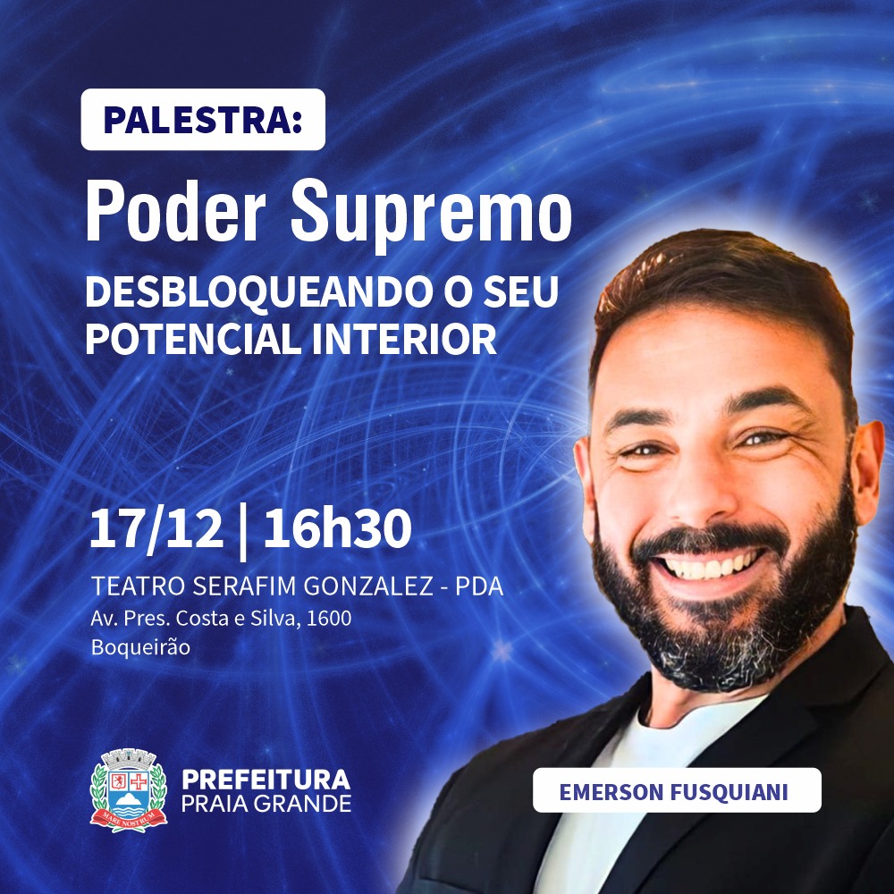 Para estimular o autoconhecimento, aprimorar habilidades e promover o treinamento comportamental, Praia Grande recebe na próxima terça-feira, dia 17, às 16h30, a palestra gratuita “Poder supremo, desbloqueando o seu potencial interior”, ministrada pelo empresário Emerson Fusquiani. O evento será realizado no Palácio das Artes (Avenida Presidente Costa e Silva, 1600, Bairro Boqueirão).